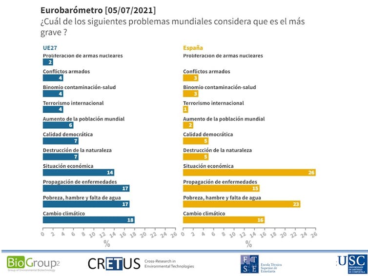 En julio de 2021 se publicaron los resultados del informe elaborado por el Eurobarómetro sobre la preocupación que los ciudadanos europeos tienen ante diversos problemas mundiales. El “cambio climático” se sitúa como el problema más apremiante, seguido muy de cerca por la “pobreza, hambre y falta de agua” y “la propagación de enfermedades”.